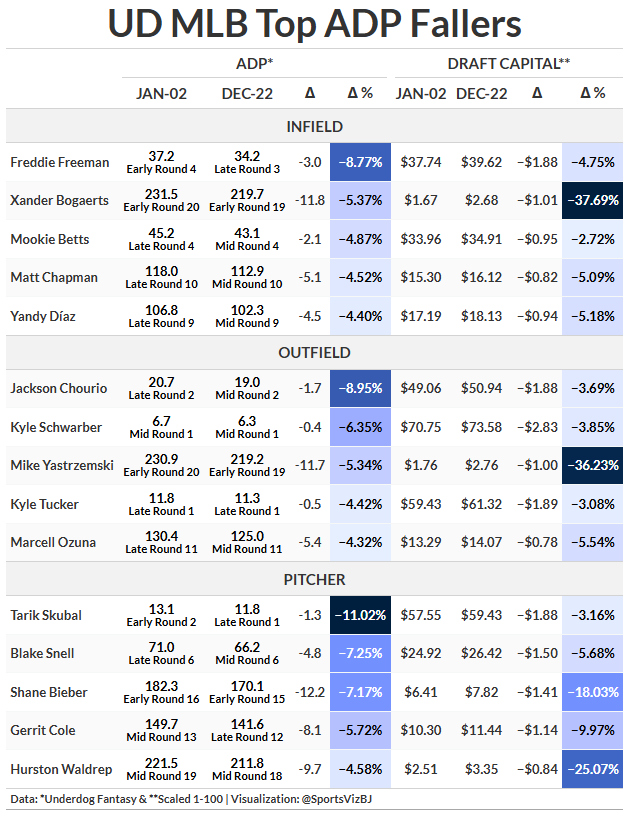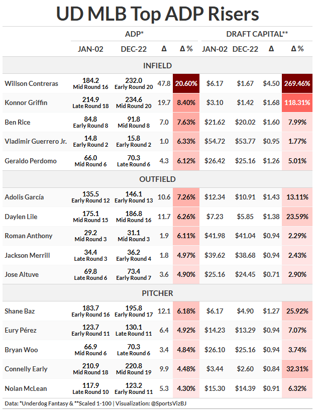 With The Bullpen at 75% filled, the release of Underdog’s flagship Best Ball contest The Dinger is just around the corner. The ADP landscape continues to evolve as MLB teams look to finalize their rosters for the upcoming season. To help you prepare for drafts, I’ve highlighted some recent risers and fallers, detailing why they may or may not be worth drafting at their new cost.