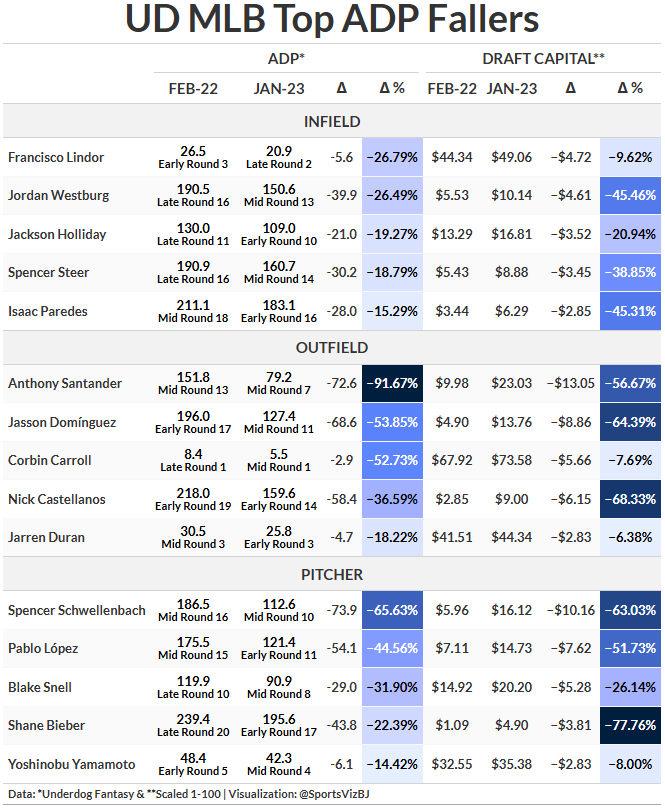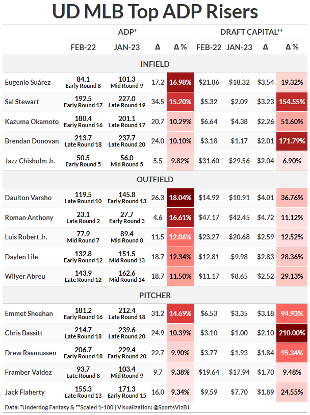 Baseball is BACK. Spring Training is underway, and the World Baseball Classic is just around the corner. Drafters finally get a chance to determine if their priors match the eye test and reevaluate if they’re overweight or underweight on their targets and fades. March will be ripe with news and updates as teams start closing in on their Opening Day rosters, so what better time to look at who’s gaining or losing steam in best ball drafts?