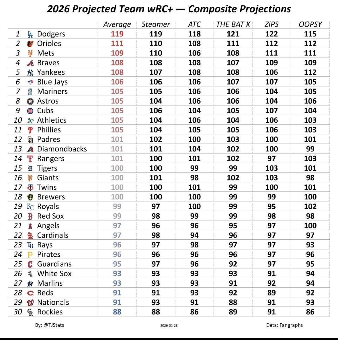 Friend of the show, TJ Stats, recently shared the projected Team wRC+ leaderboard based on composite projections, and the Orioles slot in at 2nd behind the Dodgers. Because of their poor 2025, many Orioles hitters are available throughout the draft, and are discounted significantly. Even if they aren’t part of a main stack within your build, tacking on two to three Orioles gives you access to a lineup poised to bounce back and make some noise in the AL East.